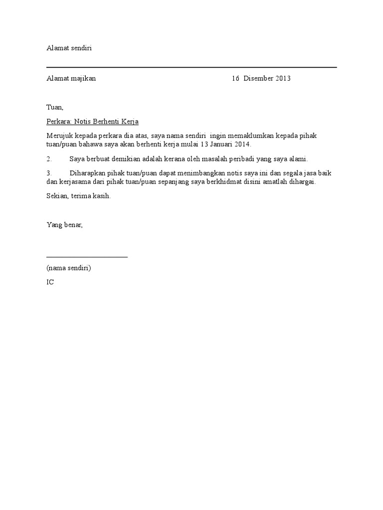Contoh Surat Berhenti Kerja Atas Sebab Peribadi